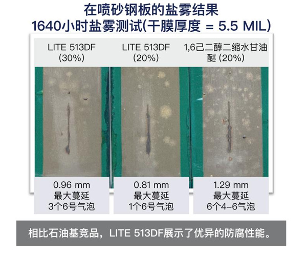 LITE 513DF是一款基于腰果殼油的新型高生物含量稀釋劑,它的環(huán)氧當(dāng)量比標(biāo)準(zhǔn)的513型號要低。這款產(chǎn)品適用于環(huán)氧涂料、單組分和雙組分粘合劑以及復(fù)合材料。LITE 513DF粘度低,具有優(yōu)異的稀釋能力,與雙酚A型液體環(huán)氧樹脂的添加重量曲線如圖所示。作為稀釋劑,它在環(huán)境溫度和低溫下具有良好的硬度發(fā)展。與其他腰果殼油改性的材料類似,LITE 513DF具有良好的耐水性和柔韌性。在涂料應(yīng)用中,LITE 513DF在長期鹽霧試驗中表現(xiàn)出非常好的防腐性能,請見本頁面板的圖片。在粘合劑應(yīng)用中,這種環(huán)氧稀釋劑還可作為改性劑,提高伸長率和粘結(jié)強(qiáng)度,同時將對Tg和抗拉強(qiáng)度的影響降至低。
